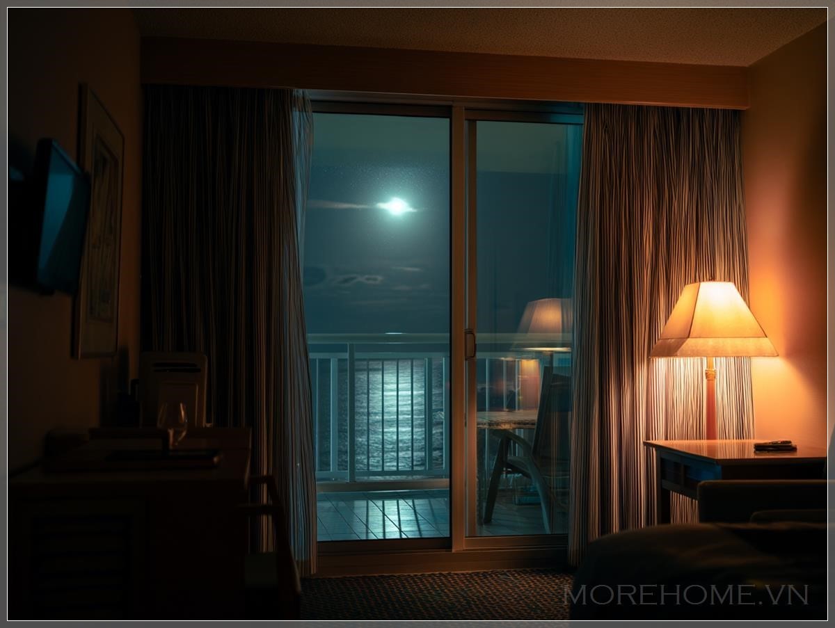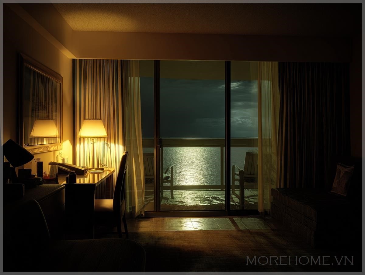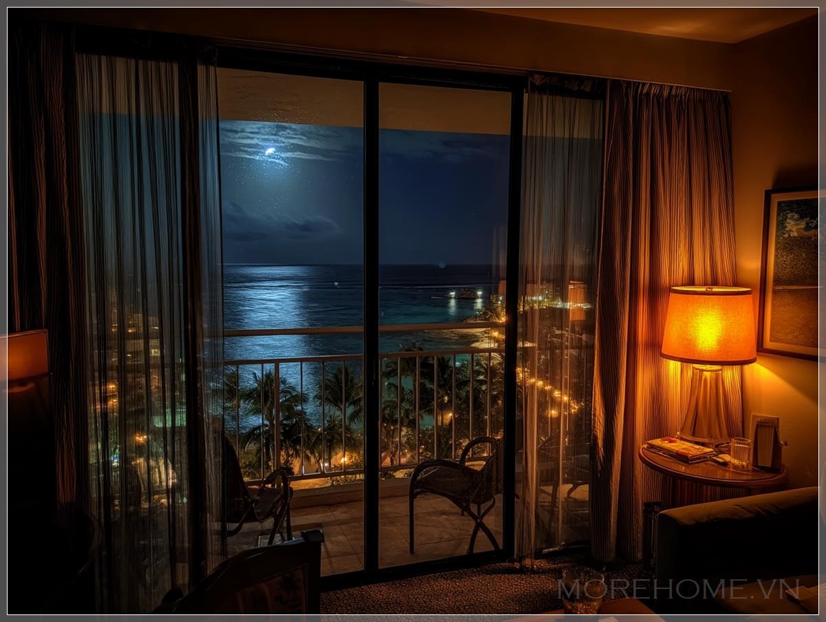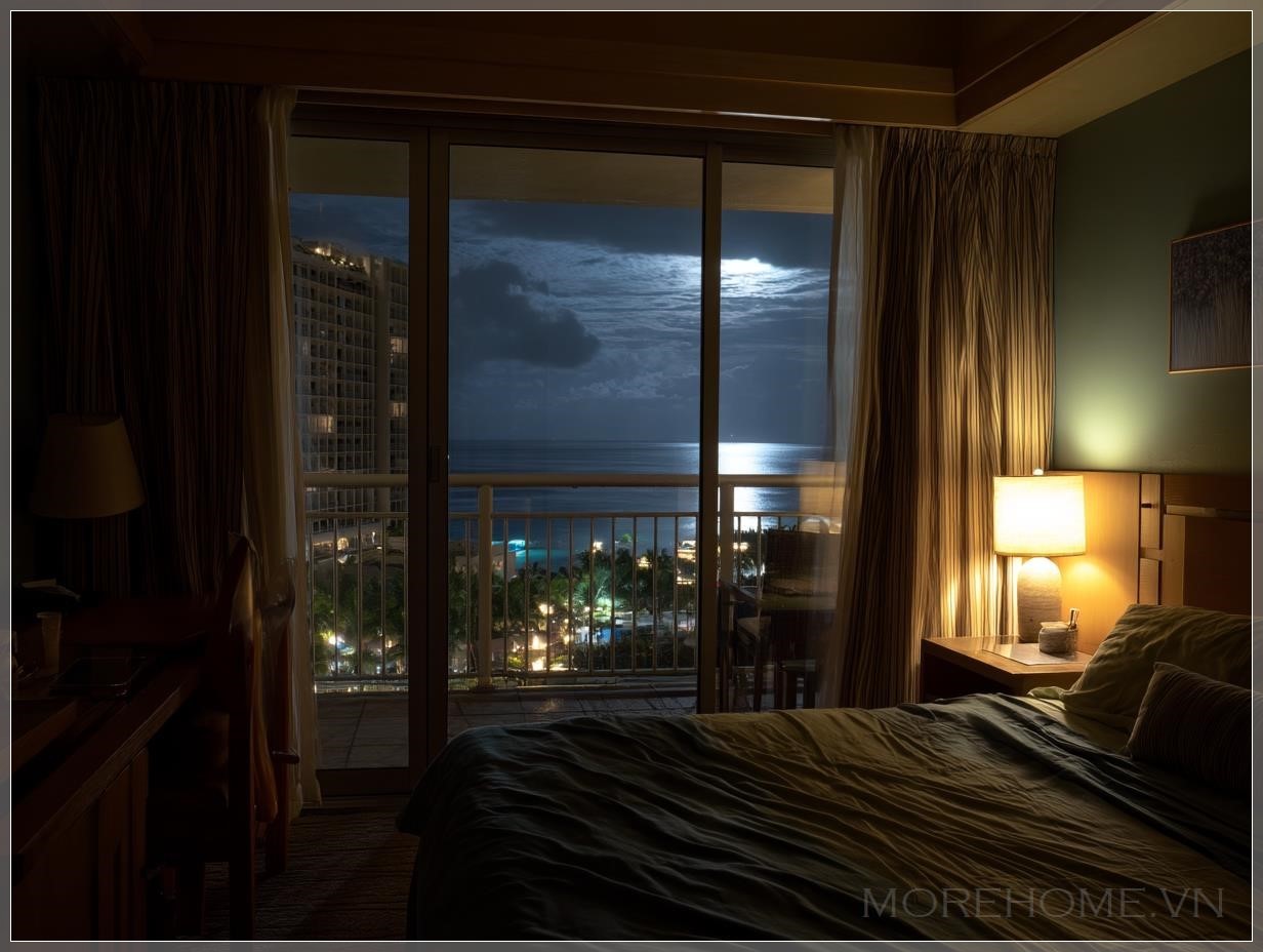 Cánh cửa kính dẫn ra ban công đang khẽ mở, để lộ một luồng gió nhẹ từ biển thổi vào, đủ để khiến rèm trắng mỏng manh lay động như đang thở theo nhịp sóng xa. Ngoài kia, biển lặng như tờ, mặt nước đen nhánh phản chiếu ánh trăng rọi xuống từ bầu trời nhiệt đới trong vắt không gợn mây. Những đốm sáng mờ mờ của tàu xa xa dường như chỉ là những dấu chấm trong một bức tranh siêu thực đầy yên bình.