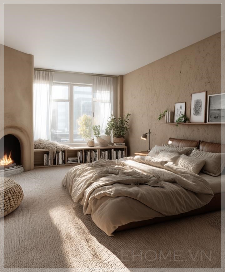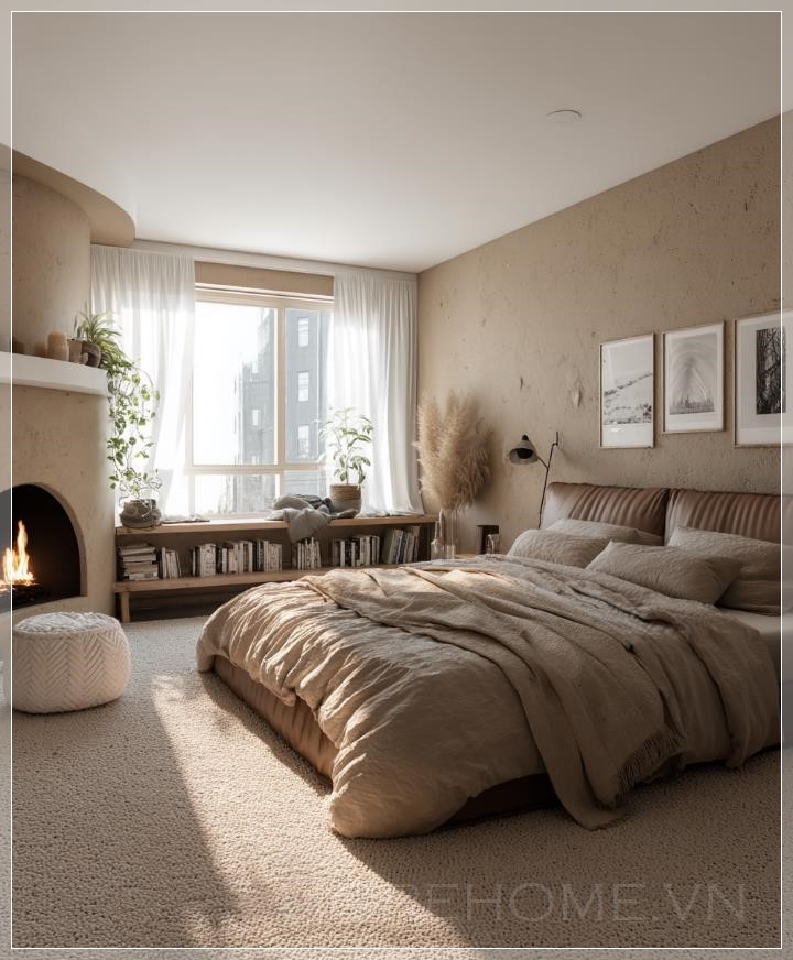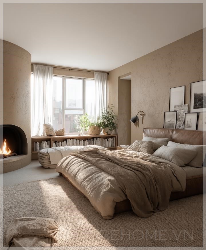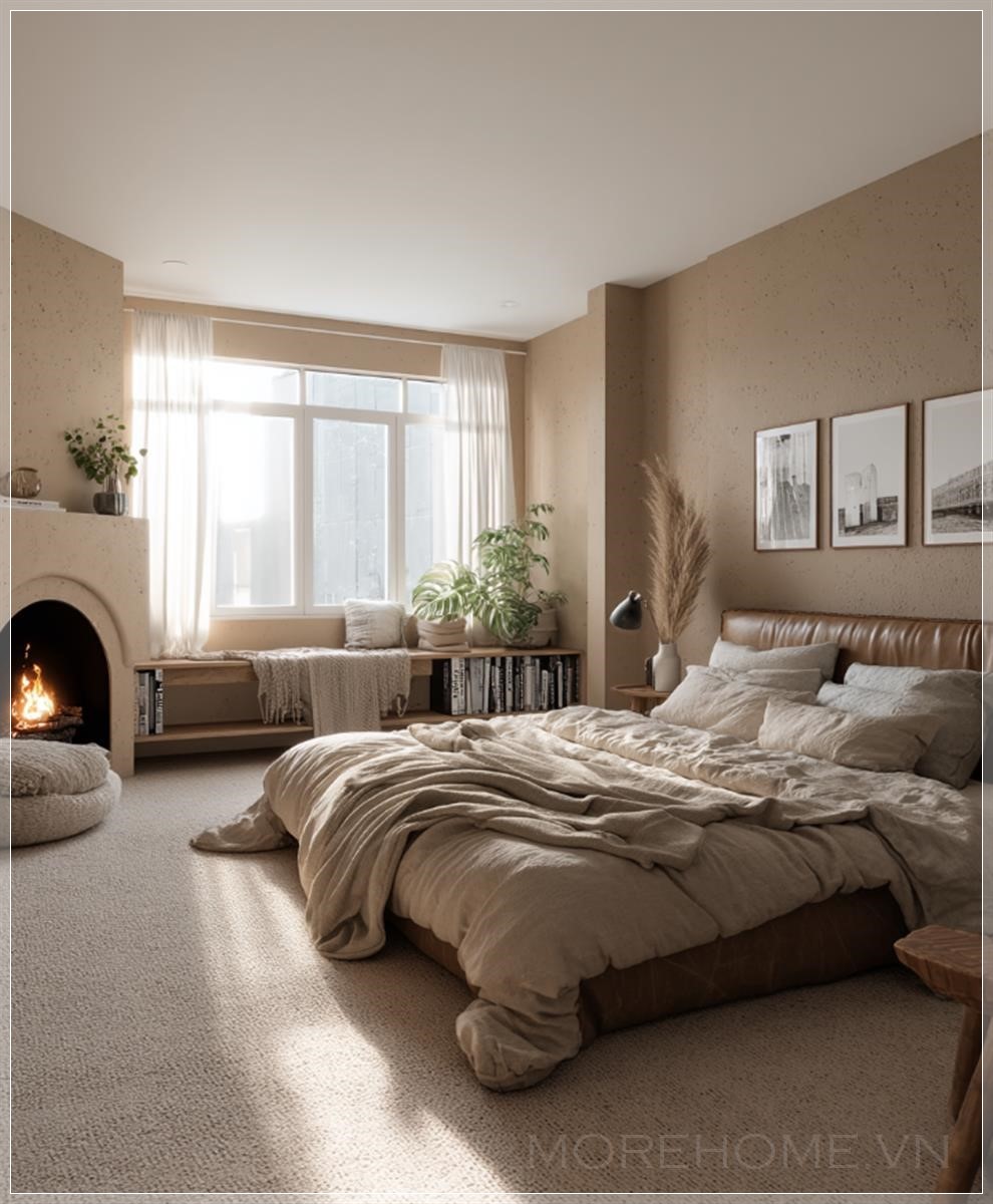 Khi ánh hoàng hôn rọi qua khung cửa sổ lớn, căn phòng master bừng lên vẻ ấm áp của một chiều tĩnh lặng. Bức tường sơn sắc nâu đất đậm ôm trọn không gian, tạo nên nền phông sâu sắc và vững chãi cho tổng thể. Chiếc giường king-size đặt chính giữa phòng, được phủ bởi lớp chăn ga linen màu than chì và xám taupe, mềm mại và mát lạnh, mang đến cảm giác thư thái tuyệt đối sau một ngày dài.