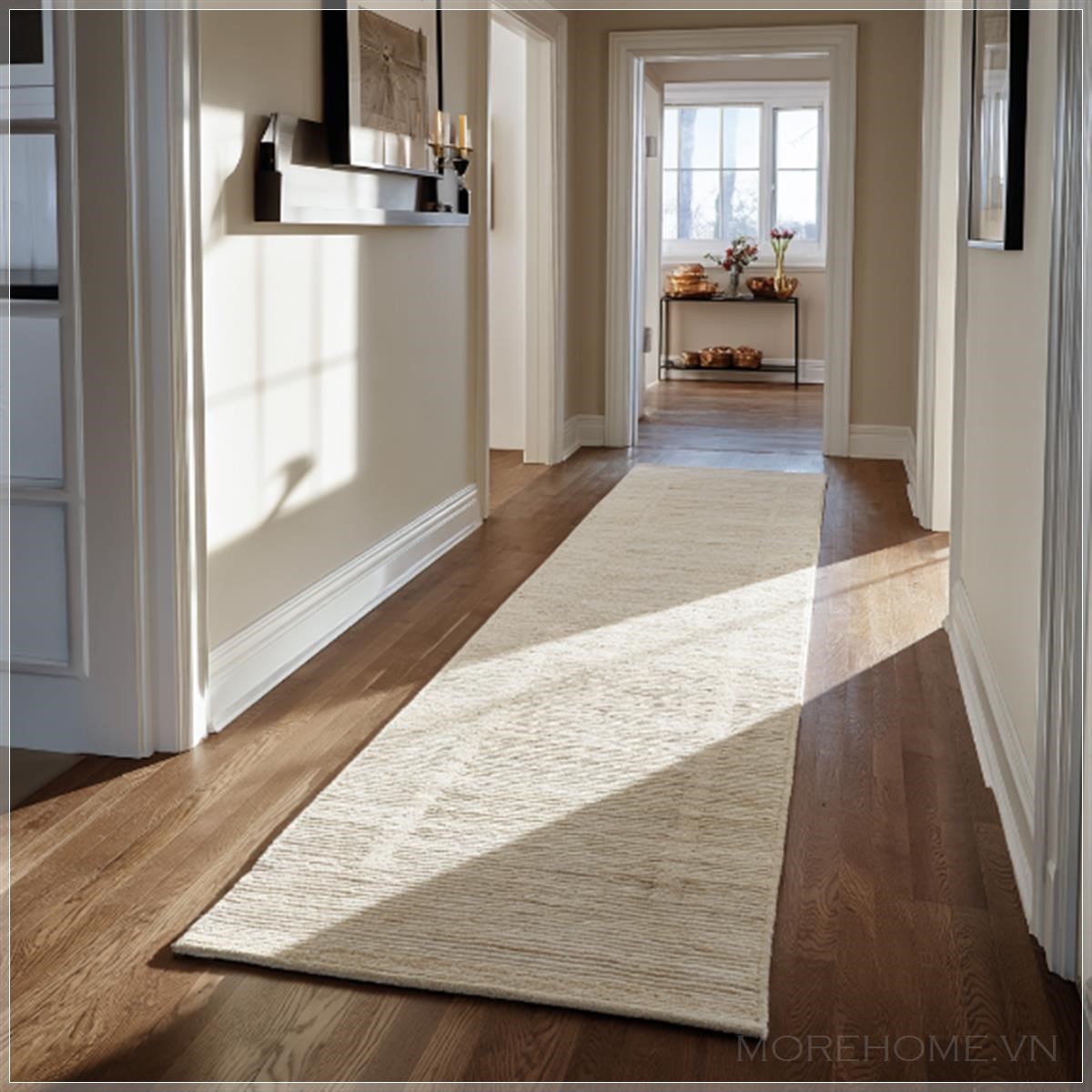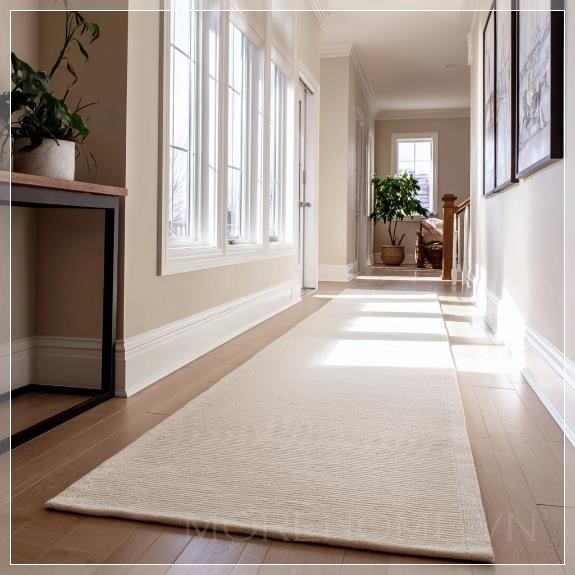 Hành lang vốn là một không gian chuyển tiếp giữa các phòng, nhưng khi được trang trí bằng một tấm thảm dài như thế này, nó trở thành một điểm nhấn, một phần không thể thiếu trong việc thể hiện phong cách cá nhân của gia chủ. Không gian trở nên ấm cúng hơn, nhưng vẫn giữ được sự thanh thoát, nhẹ nhàng, mang lại cảm giác dễ chịu cho mỗi bước đi.