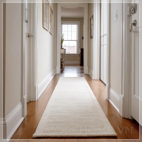 Trong không gian nhà ở hiện đại, một tấm thảm dài màu trắng, đơn giản, có thể mang lại một cảm giác thanh thoát, dễ chịu nhưng không kém phần sang trọng. Khi đặt một tấm thảm như vậy vào hành lang, chúng ta không chỉ đang bổ sung một món đồ trang trí, mà còn tạo nên một dòng chảy mượt mà cho không gian, kết nối các khu vực trong ngôi nhà một cách tự nhiên và hài hòa.