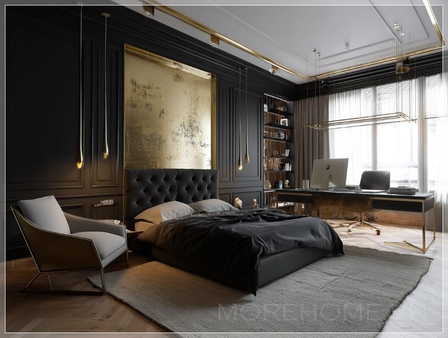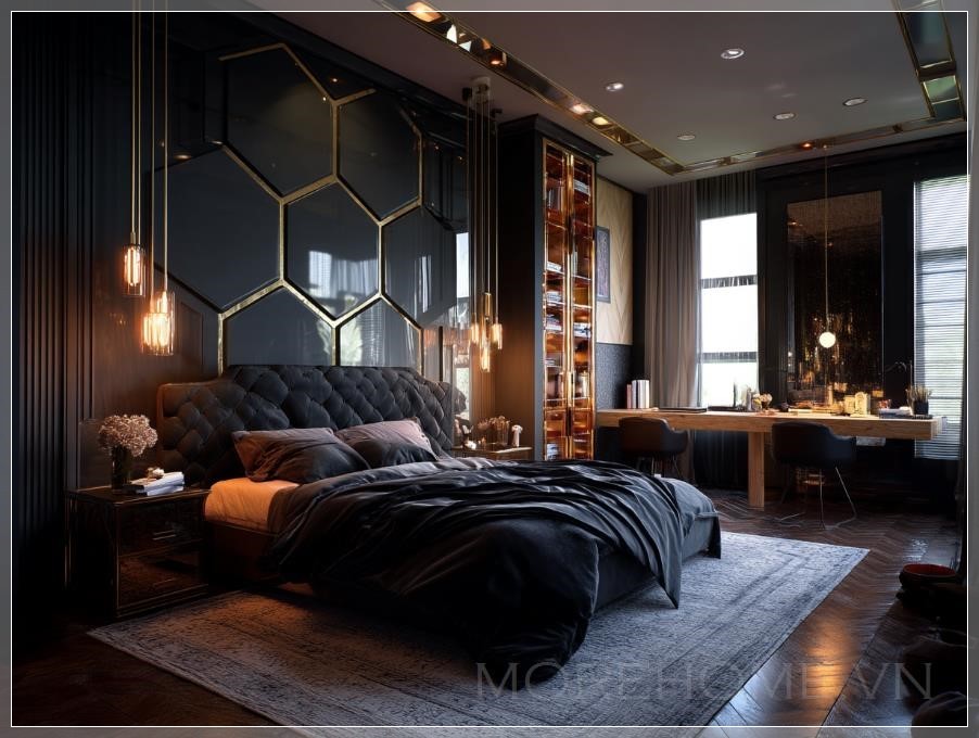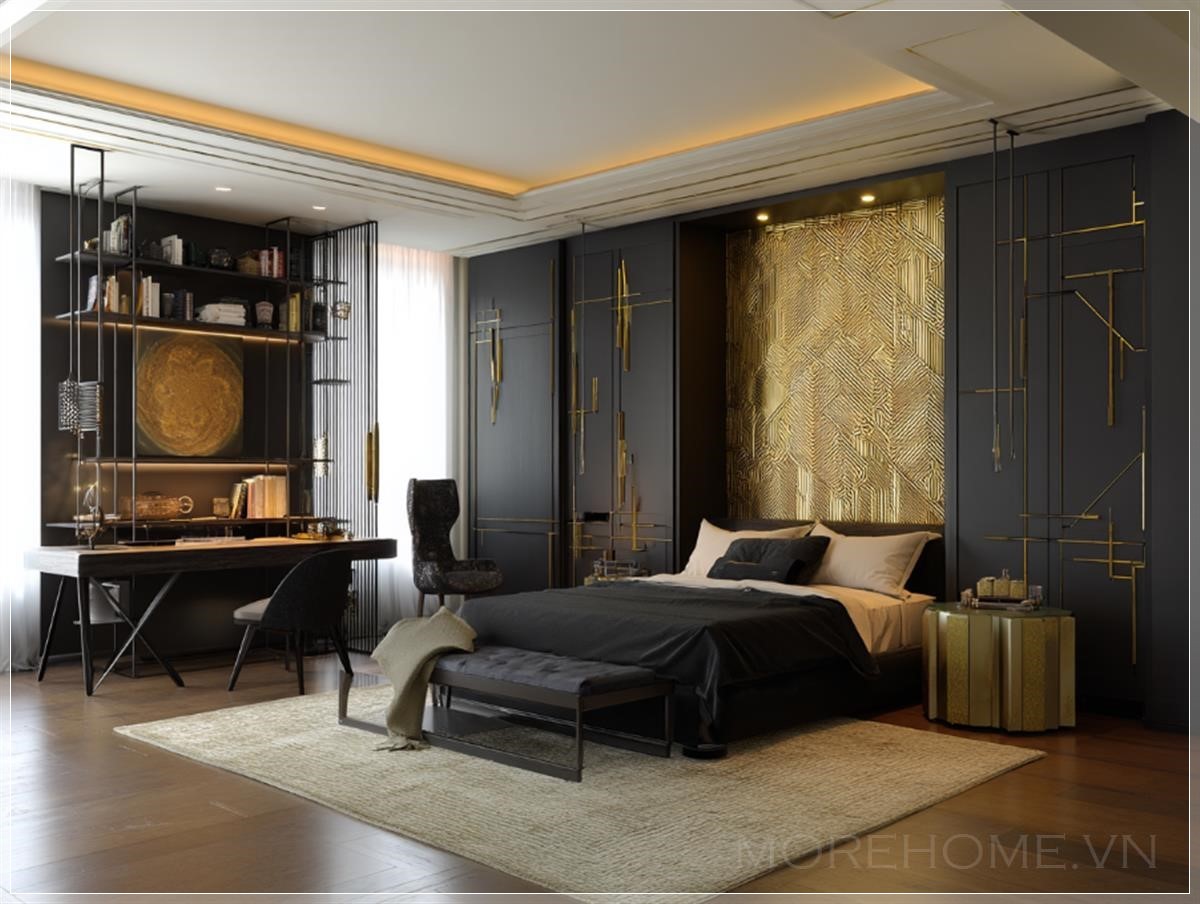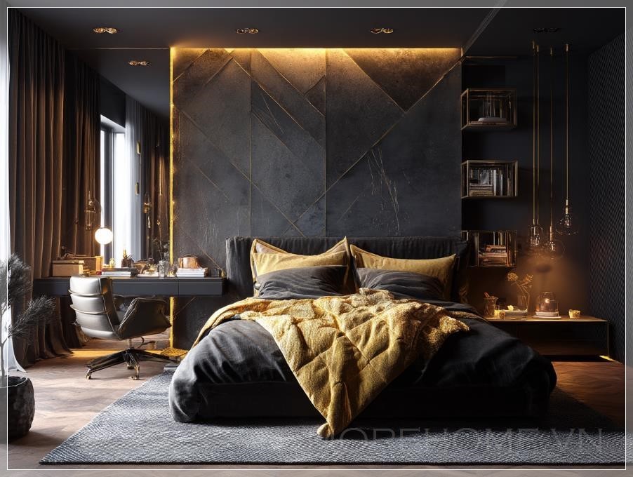Phòng ngủ được thiết kế theo phong cách đen vàng không chỉ thể hiện sự quyền lực mà còn mang lại cảm giác thư giãn tối đa. Màu sắc đen chủ đạo kết hợp với các điểm nhấn vàng giúp không gian thêm phần huyền bí và lôi cuốn. Những món đồ nội thất như giường ngủ và bàn làm việc đều được chọn lựa kỹ lưỡng để đảm bảo sự hòa hợp giữa sự hiện đại và chức năng sử dụng.