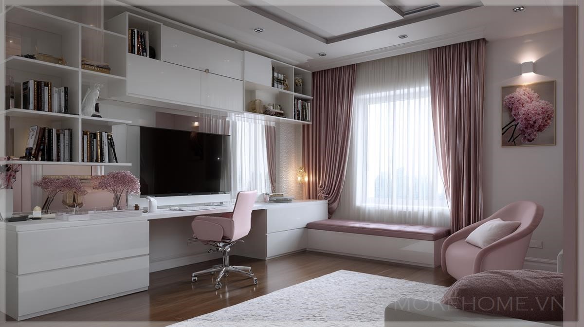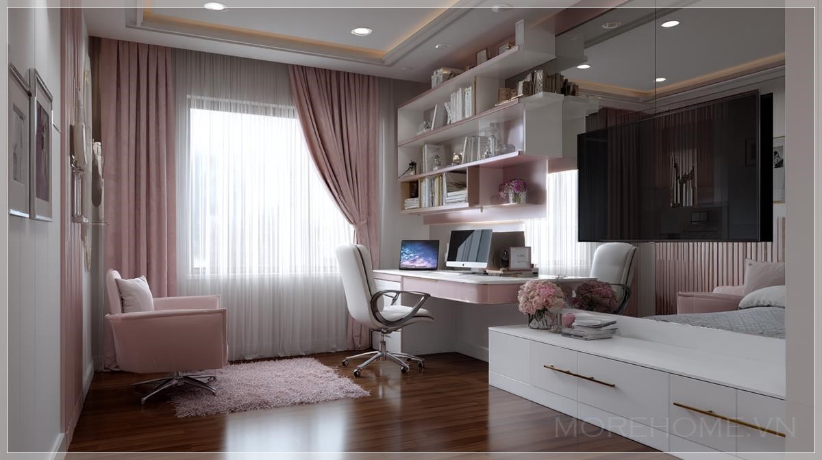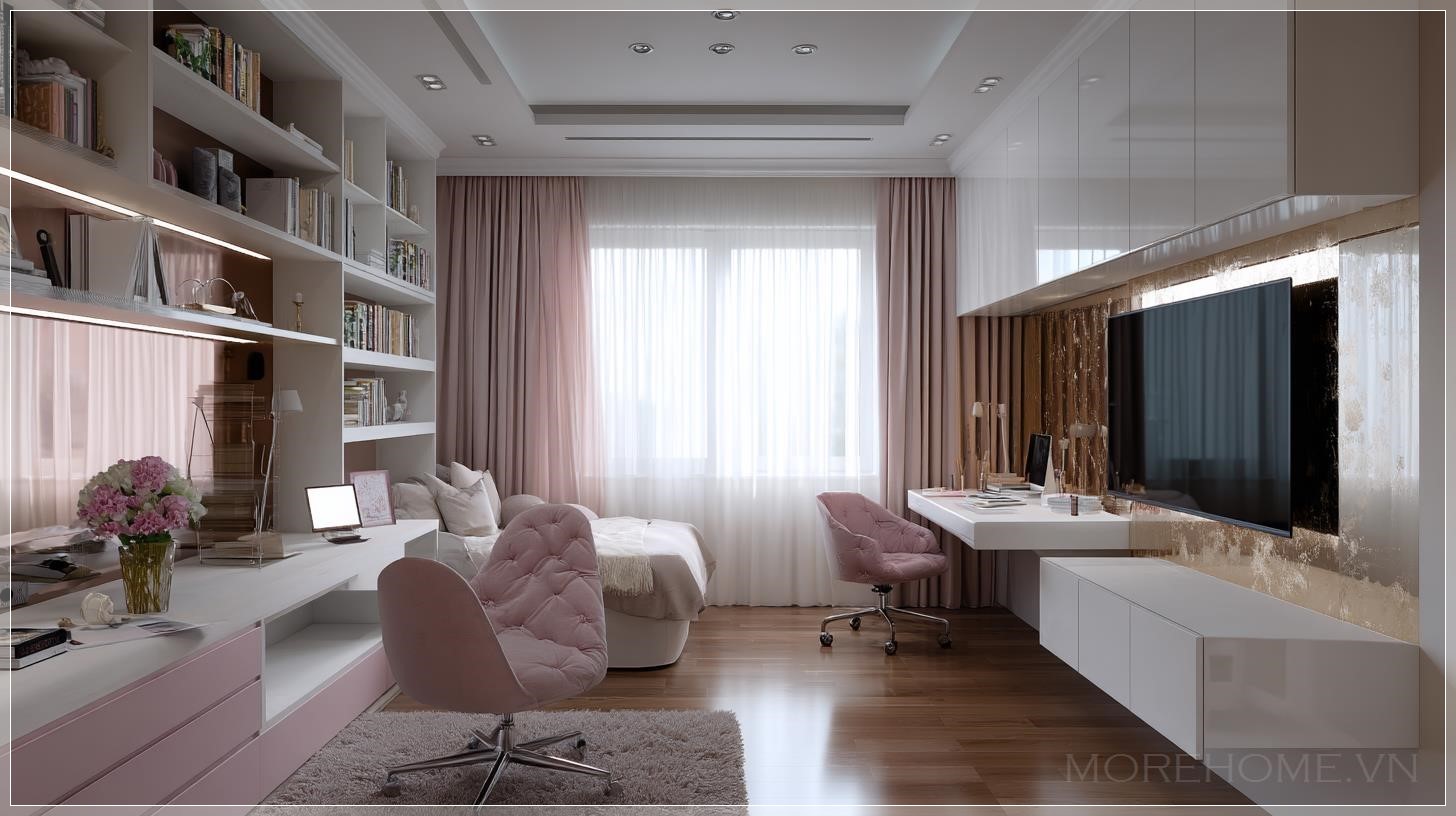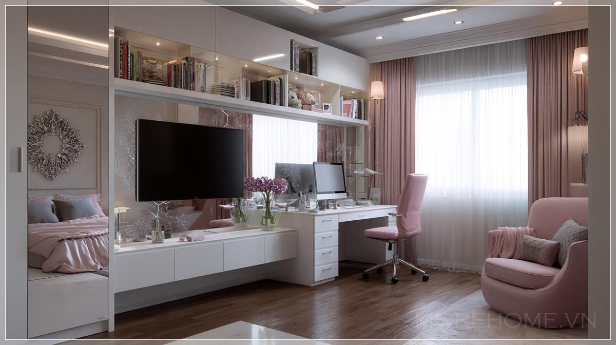 Phòng ngủ không chỉ là nơi nghỉ ngơi mà còn là không gian lý tưởng để thể hiện cá tính và phong cách riêng của mỗi người. Đặc biệt đối với các bạn trẻ, không gian này cần phải vừa tiện nghi, hiện đại lại vừa mang lại cảm giác thoải mái. Một trong những thiết kế phòng ngủ thú vị hiện nay là việc kết hợp bàn học và kệ tivi trong cùng một không gian. Với tông màu hồng và trắng, kết hợp với vật liệu gỗ tự nhiên, thiết kế này mang lại một không gian phòng ngủ trẻ trung và năng động.