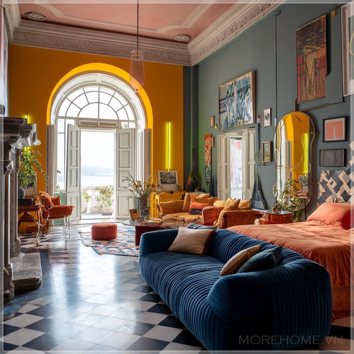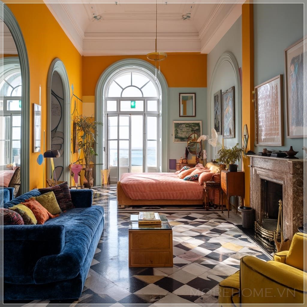 Không gian phòng ngủ này cũng mang lại cảm giác gần gũi và thân thiện nhờ vào sự kết hợp của ánh sáng tự nhiên và các chi tiết cổ điển. Các cửa sổ lớn cho phép ánh sáng mặt trời tràn ngập vào phòng, khiến không gian luôn tràn đầy sinh khí và thư giãn. Cộng với các chi tiết nội thất như ghế sofa màu xanh dương, đèn neon vàng, và các món đồ trang trí nghệ thuật, phòng ngủ này thực sự tạo ra một không gian sống động và thú vị.