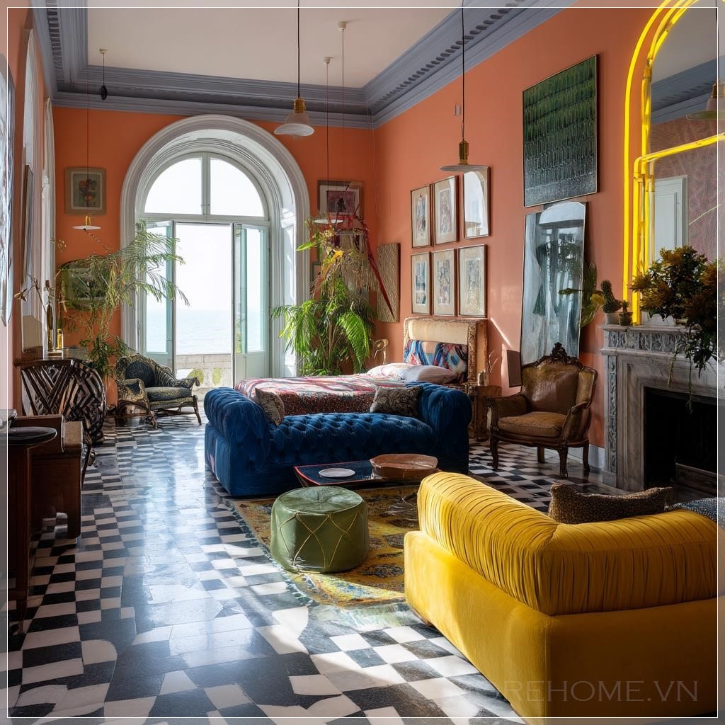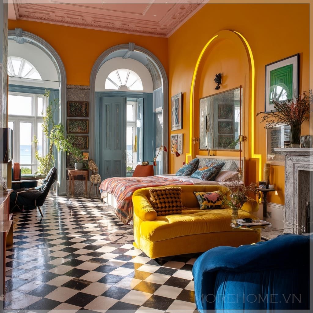 Điểm nổi bật của không gian này chính là việc sử dụng màu sắc đậm và bắt mắt. Những chiếc ghế sofa nhung màu xanh dương nổi bật giữa nền tường với họa tiết hình học. Ánh sáng neon vàng tạo nên một bầu không khí ấm áp và hiện đại, trong khi các chi tiết nội thất như cửa vòm, gương cổ điển, và lò sưởi đá marble đều mang đậm dấu ấn của phong cách cổ điển. Sự kết hợp giữa những màu sắc tươi sáng như cam, hồng, xanh lá và đen không chỉ tạo ra sự đối lập mạnh mẽ mà còn làm tăng tính thẩm mỹ và sự sống động cho không gian.