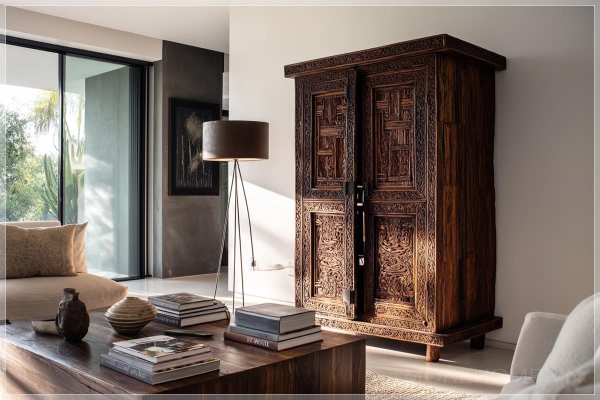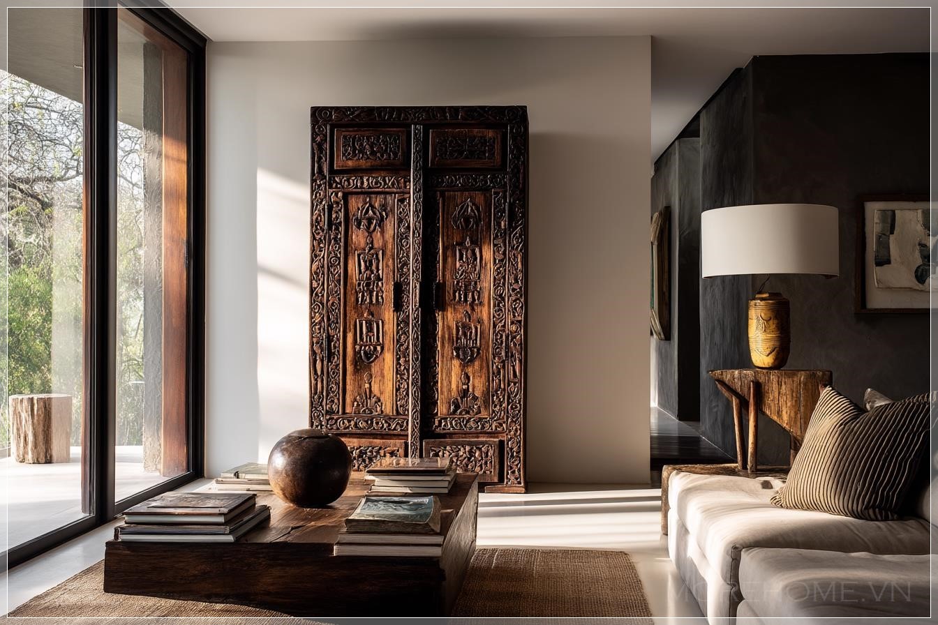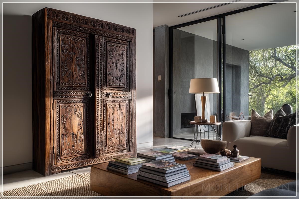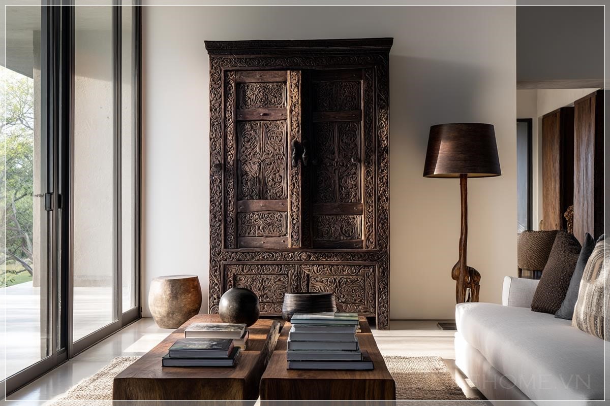 Tủ quần áo gỗ tối màu, với những chi tiết chạm khắc tỉ mỉ mang đậm ảnh hưởng của nghệ thuật Châu Phi, đứng vững bên cạnh bức tường trắng, nổi bật với các đường vân gỗ tự nhiên. Các họa tiết kim loại mạ trên bề mặt gỗ tạo nên một điểm nhấn thẩm mỹ ấn tượng, khiến mọi ánh nhìn đều bị cuốn hút. Không gian này được tạo dựng bằng cách sử dụng những chất liệu mạnh mẽ, mang tính biểu tượng, từ gỗ cho đến thép, tất cả kết hợp lại trong một tổng thể đầy chất nghệ thuật, phản ánh sức mạnh của văn hóa Châu Phi. Bên cạnh đó, chiếc bàn cà phê khổng lồ, với đống sách trang trí và một chiếc đèn bàn lớn, càng làm nổi bật thêm sự sang trọng, tinh tế của không gian.
