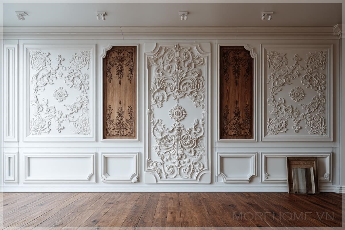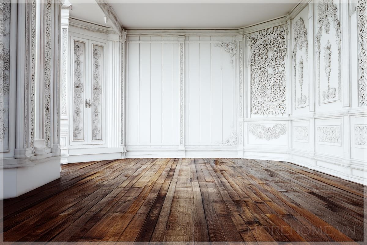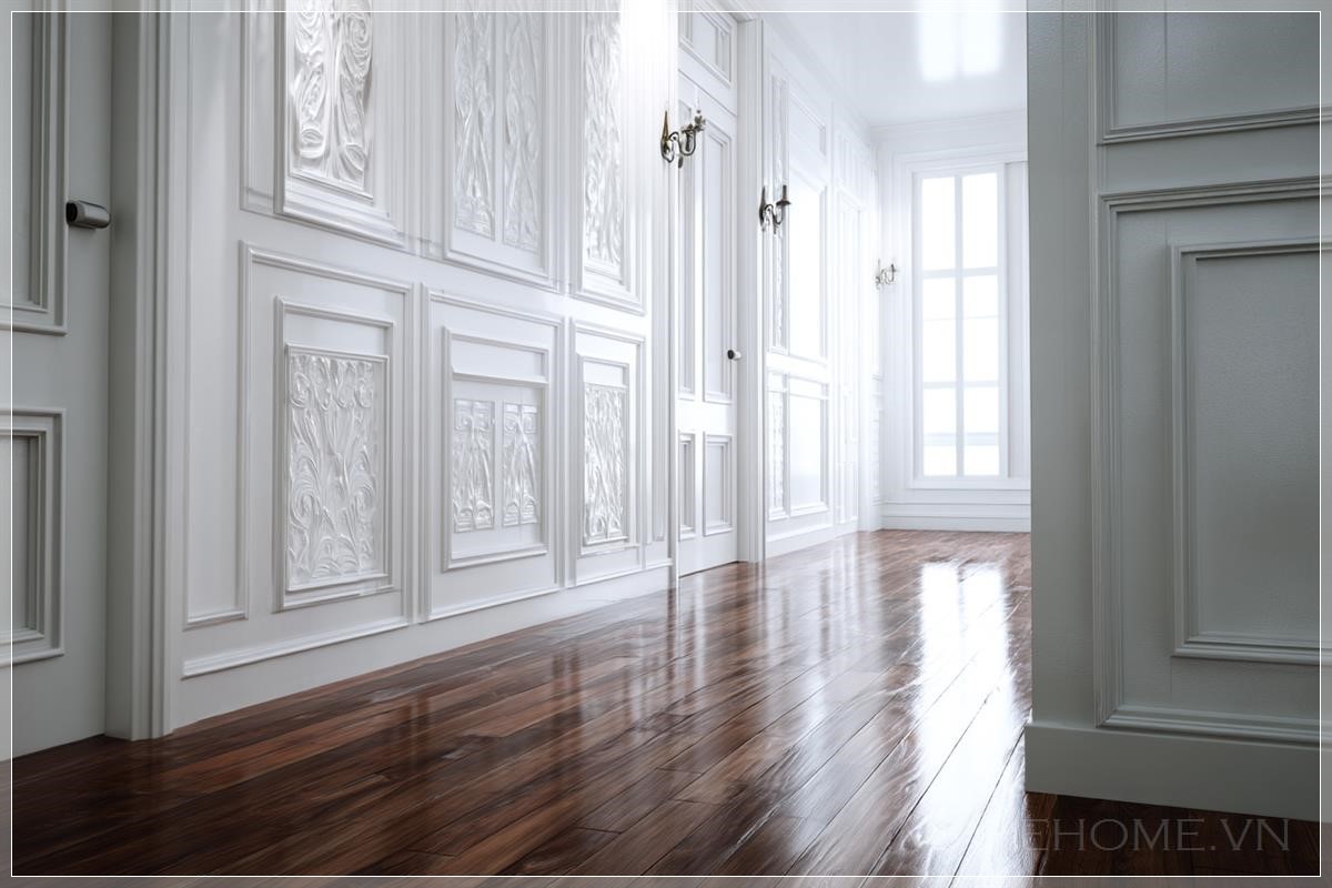 Không gian thiết kế mộc mạc chủ yếu dựa vào các yếu tố tự nhiên để tạo nên một không gian sống thanh bình. Bức tường trắng chạm khắc tinh tế, kết hợp với sàn gỗ màu óc chó bóng loáng tạo nên một không gian giản dị nhưng đầy lôi cuốn. Những chi tiết như ánh sáng nhẹ nhàng, màu sắc ấm áp như đỏ đất, màu gỉ sắt, và màu gỗ tự nhiên giúp không gian trở nên tươi mới và đầy cảm hứng. Sự kết hợp này không chỉ mang lại vẻ đẹp tự nhiên mà còn phản ánh sự sang trọng, mang tính thẩm mỹ cao, đặc biệt phù hợp với những gia đình muốn tận hưởng không gian yên bình nhưng vẫn đầy đủ chức năng.