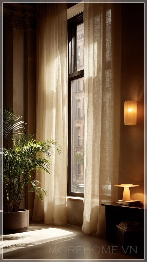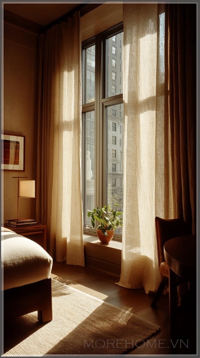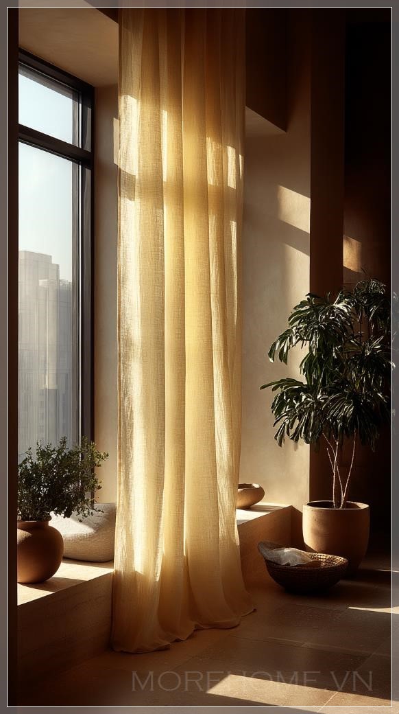 Ảnh hưởng mạnh mẽ của ánh sáng tự nhiên trong không gian tối giản giúp tạo nên một bầu không khí nhẹ nhàng, thư giãn. Cửa sổ lớn với ánh sáng tự nhiên chiếu qua là một yếu tố không thể thiếu trong thiết kế này. Lớp vải lanh nhẹ nhàng bay theo làn gió vừa mang đến sự mềm mại, vừa tạo cảm giác mát mẻ, thoải mái cho không gian. Màu sắc chủ đạo của không gian thường là các tông màu be nhẹ nhàng, tạo cảm giác yên bình và thư giãn.