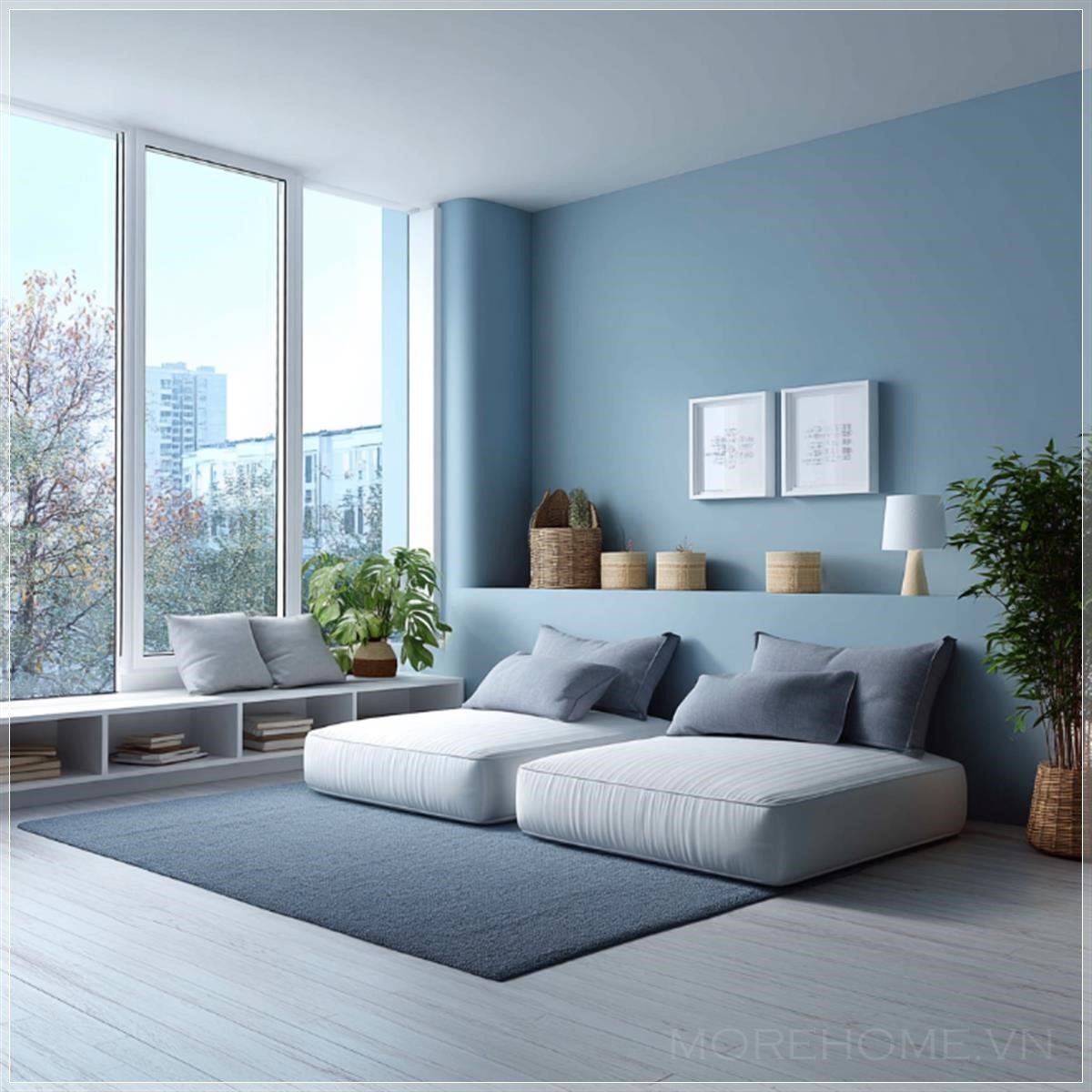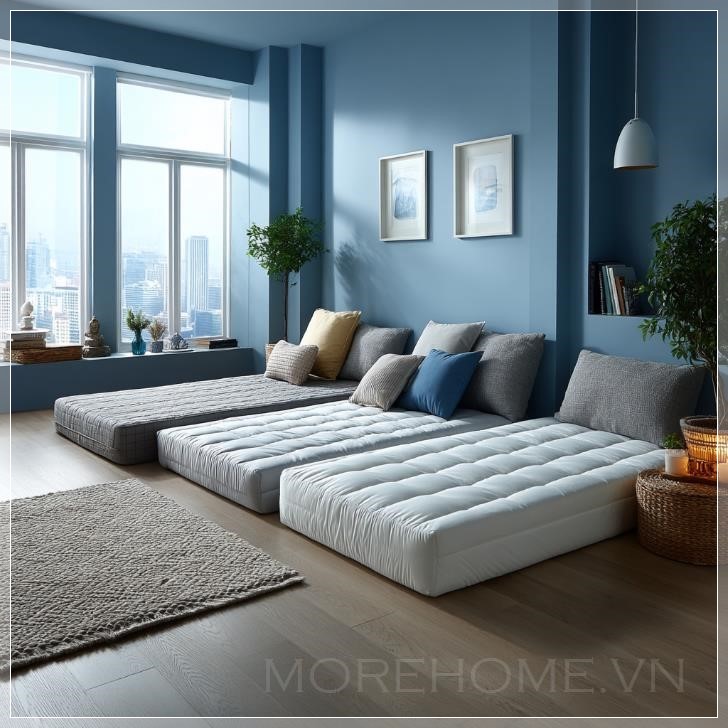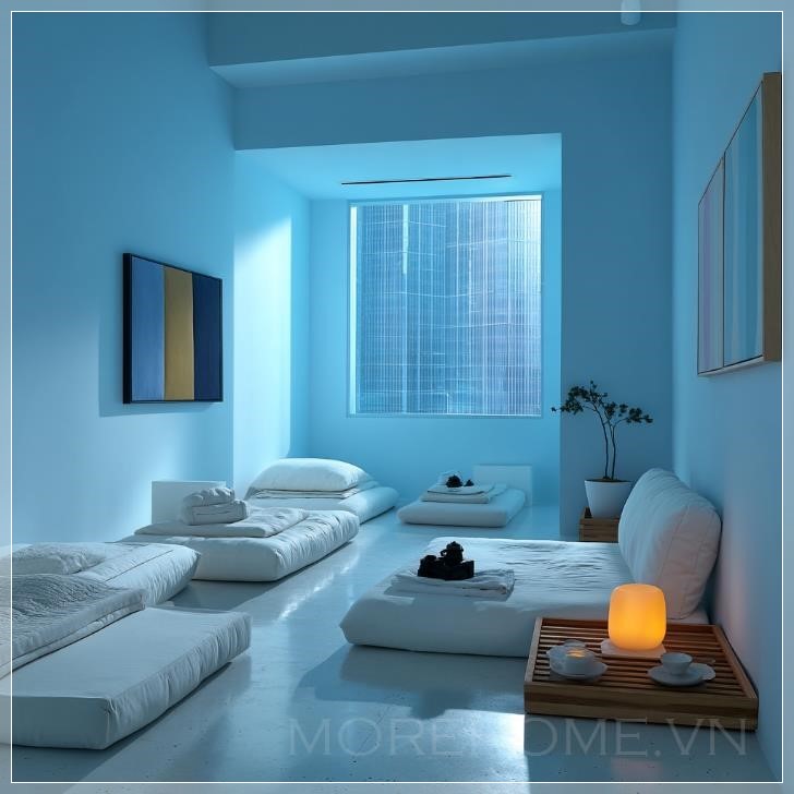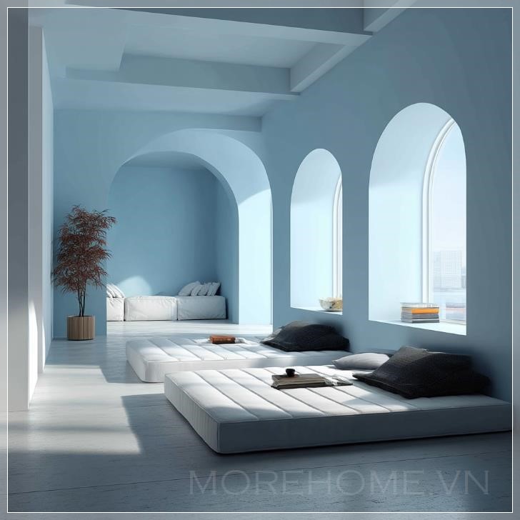 Phong cách tối giản trong thiết kế nội thất không chỉ đơn giản là việc loại bỏ những yếu tố không cần thiết, mà còn là việc chú trọng đến sự tinh tế trong từng chi tiết. Màu sắc trắng và xanh dương được sử dụng trong không gian này không chỉ tạo cảm giác rộng rãi mà còn mang lại sự thư giãn, dễ chịu cho người sử dụng. Ba chiếc đệm đặt trong phòng không chỉ phục vụ chức năng ngủ mà còn là những yếu tố trang trí mạnh mẽ, tạo điểm nhấn cho căn phòng. Những chiếc đệm với thiết kế đơn giản nhưng thoải mái, kết hợp với các món đồ nội thất trắng tinh, mang lại cảm giác sang trọng và hiện đại.
