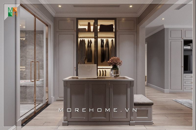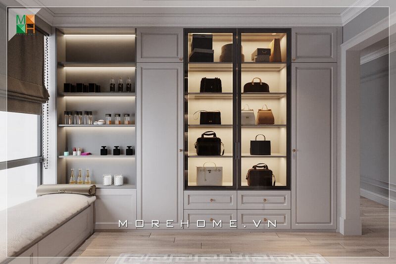 Ở giữa không gian căn phòng để đồ chung cư, nhà phố, biệt thự là chiếc tủ đa năng vừa kết hợp ghế ngồi hiện đại hợp lý và tiện ích.