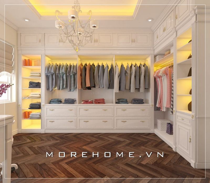 Tủ quần áo gỗ tự nhiên phun sơn trắng cao cấp, phần tay nắm mạ vàng tân cổ điển tô điểm cho căn phòng thêm cuốn hút và ấn tượng hơn