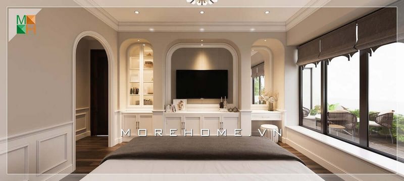 Chi tiết mềm mại, đường cong uốn lượn cổ điển và ánh sáng vàng tạo nên một không gian nghỉ ngơi sang trọng, cao cấp cho gia chủ để thư giãn.